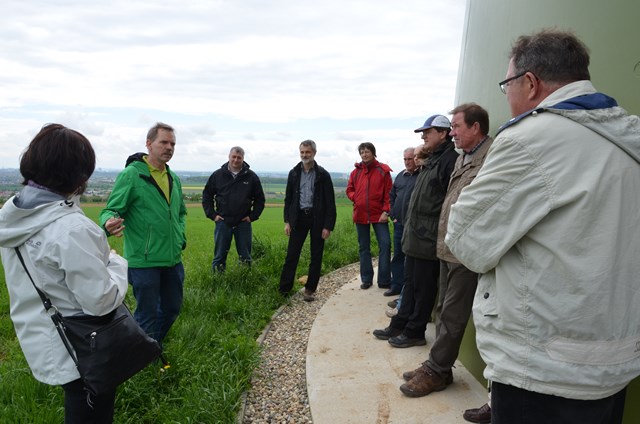 Die Bürgergenossenschaft besteht aus 360 Bürgern, die allesamt Anteile an der Anlage gezeichnet haben und somit Anteilseigner sind. Jährlich wird eine Dividende ausgeschüttet und an die Mitglieder verteilt. Eines der Gründungsmitglieder, der Genossenschaftsvorstand Dieter Hallmann, hat 26 interessierte Bürgerinnen und Bürger aus Obergrombach empfangen und in einem Zeitrahmen von mehr als 3 Stunden ausführlich die Anlage, das langwierige Genehmigungsverfahren, sowie die Schwierigkeiten mit der Couleur der Anlagengegner erläutert. Hierbei konnten durchaus auch kritische Fragen gestellt werden und wurden fachmännisch beantwortet. Der Diplomingenieur konnte nicht nur im Bereich der Anlagentechnik Rede und Antwort stehen, sondern kannte sich auch in naturschutzrechtlichen und naturschutzpraktischen Themenbereichen sehr gut aus. Aufgrund dieser Tatsache beantwortete er alle an ihn gestellten Fragen fachlich kompetent und sehr detailliert. Er stellte auch dar, dass inzwischen auch der BUND sowie nach anfänglicher Gegnerschaft der NABU voll und ganz hinter der Anlage stehen. Zum Thema „Schutz der Fledermäuse“ erläuterte uns der Fachmann, dass die in Ingersheim und Umgebung existierenden Fledermausarten in dieser Höhe überhaupt nicht vorherrschen, sondern sich mindestens 30 Meter unter dem sich drehenden Rotor bewegen und somit keine Gefahr für diese Tiere bestehe!